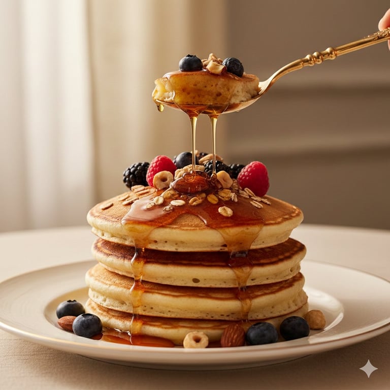 A highly structured prompt designed for generating an ultra-realistic, cinematic food commercial still image featuring a stack of American pancakes with cascading maple syrup and various toppings, emphasizing specific lighting, camera angles, and hyper-detailed textures.