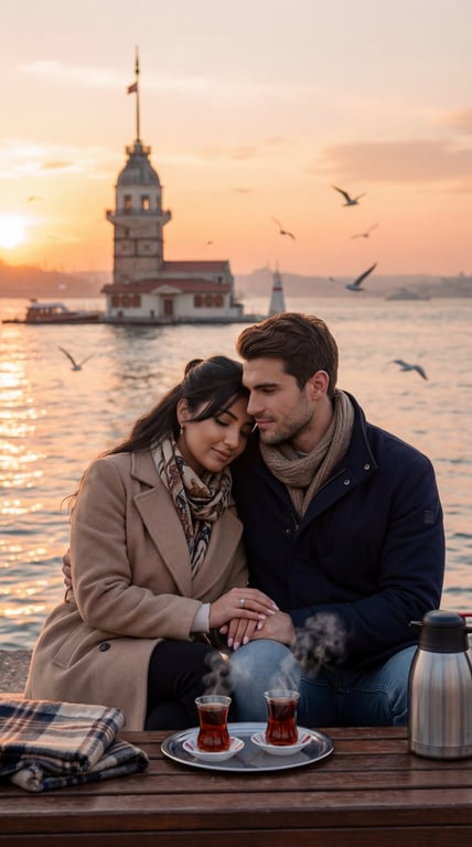A highly complex, structured JSON prompt for generating an ultra-photorealistic, candid film still of a couple during the golden hour sunset in Uskudar, Istanbul, with the Maidenâs Tower in the background. The prompt mandates strict identity locking for both subjects using reference images, focuses on intimate details like intertwined hands and steam from tea, and specifies cinematic rendering styles to achieve a natural, timeless, and romantic atmosphere.