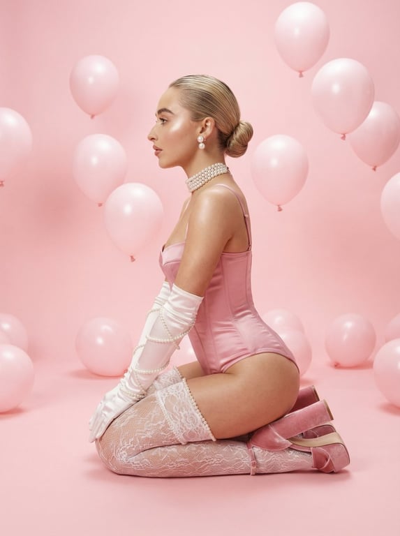 A detailed JSON prompt for the Nano Banana Pro model, designed to generate an ultra-photorealistic RAW studio portrait resembling Sabrina Carpenter in a pastel high-fashion, vintage coquette style. The subject is posed kneeling, wearing a pink satin corset and white opera gloves, set against a soft pink background with balloons.