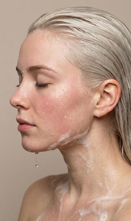 A highly technical prompt for Nano Banana Pro focused on generating an ultra-photorealistic, close-up side profile portrait of a young woman with silver hair, emphasizing wet skin texture, visible pores, water droplets, and white soapy foam. It uses macro lens settings and advanced rendering techniques (Ray tracing, Subsurface scattering) for a clean beauty campaign aesthetic.