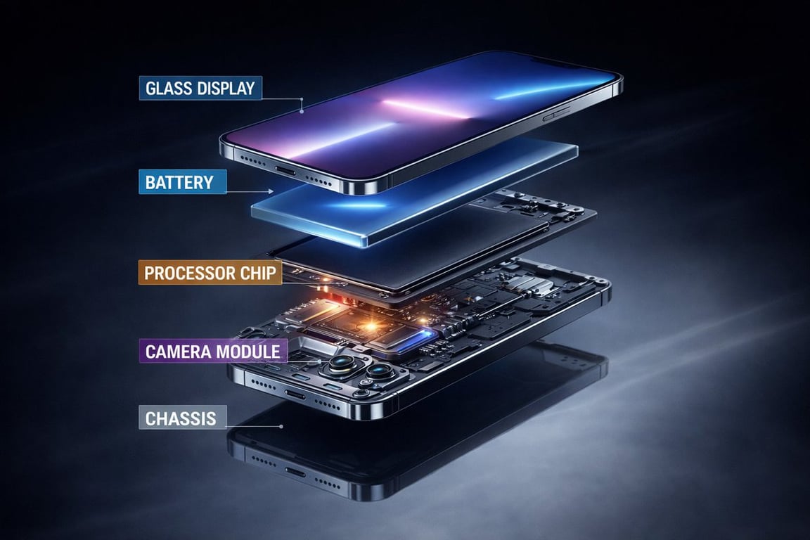 A detailed prompt for generating an ultra-premium commercial product photo of a futuristic flagship smartphone floating above a reflective surface, followed by a prompt for an exploded-view visualization of its internal components, designed for high-end tech advertising.