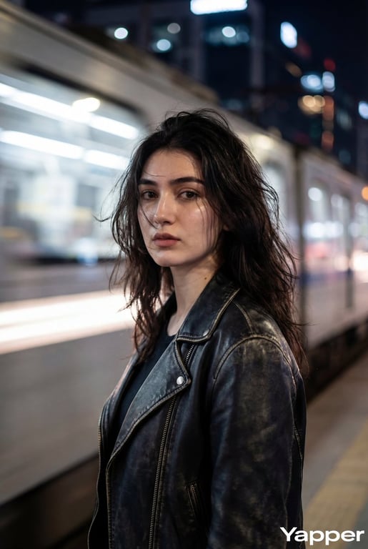 A prompt for Nano Banana 2 to create an ultra-realistic cinematic portrait of a subject (man or woman) wearing a distressed black leather jacket in an urban night setting, featuring dramatic lighting from passing train lights and motion blur.