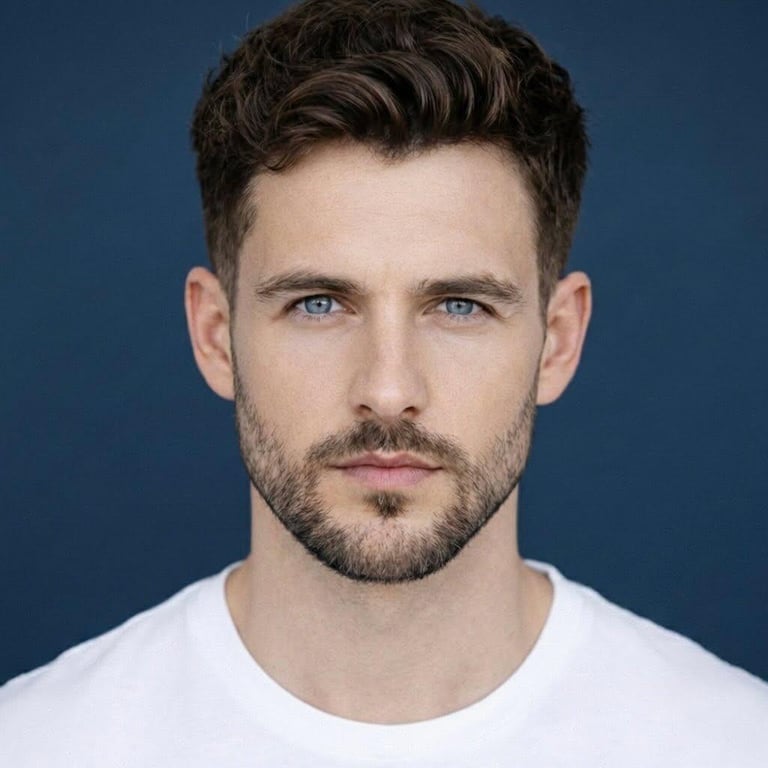 A prompt for generating an ultra-realistic, high-detail close-up portrait of a handsome young man with specific facial features (light blue eyes, textured brown hair, groomed beard), centered, with neutral expression, set against a solid blue background using studio lighting and shallow depth of field.