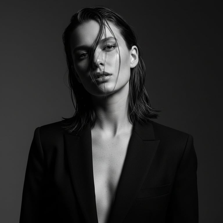 A highly detailed, structured prompt designed for ultra-realistic editorial fashion photography, focusing on a dramatic, high-contrast monochrome portrait of a young woman in a black blazer. It specifies subject details, lighting, atmosphere, and precise camera settings like lens and aperture for maximum photorealistic clarity.