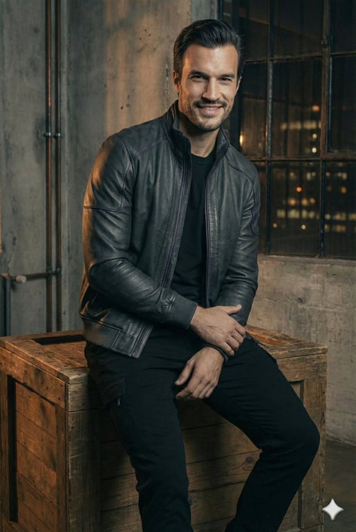 A structured prompt for generating an ultra-realistic, high-end fashion editorial portrait of a man in futuristic casual wear. It emphasizes minimal cinematic lighting (spotlight), a deep dark blue background, specific camera settings (85mm lens, f1.8 aperture), and sharp focus for a premium look.