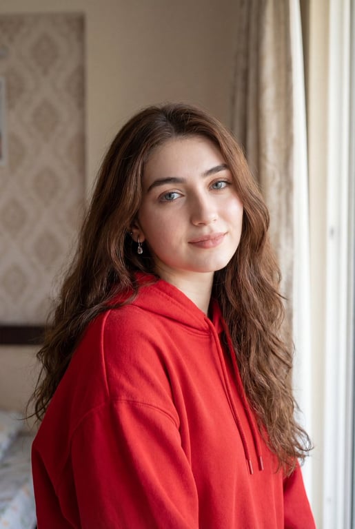 A detailed prompt for generating an ultra-realistic portrait of a young woman with long wavy chestnut hair, wearing a bright red oversized hoodie. It specifies the indoor setting (cozy modern bedroom), lighting (soft daylight from a window), camera specs (50mm lens, shallow depth of field), and overall cinematic photorealistic quality.