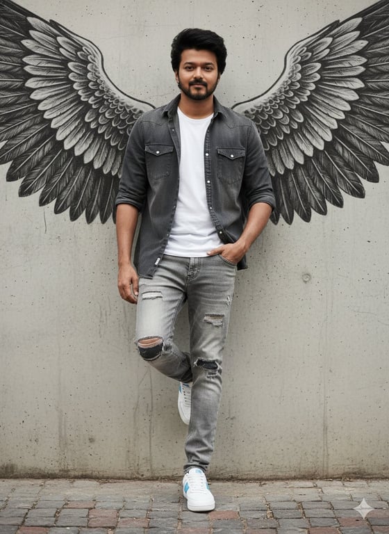 A high-fidelity JSON prompt for Gemini Nano Banana Pro to generate an ultra-photorealistic, full-body portrait of a person leaning against a concrete wall. The prompt requires using an uploaded face reference and features large, black-and-white painted angel wings on the wall, aligned to appear as if they belong to the subject, creating an urban surrealist aesthetic.