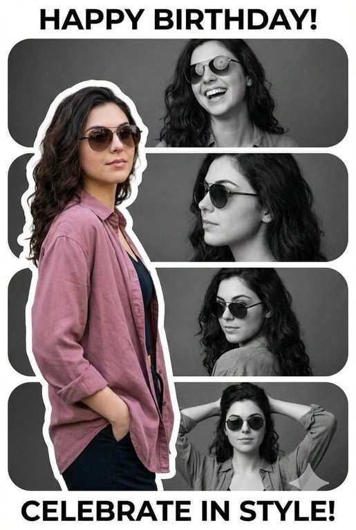 A prompt for Nano Banana Pro to create a vertical birthday poster collage. The design features a background of stacked, rounded rectangles containing monochrome cinematic photos of a young girl, overlaid with a high-resolution, full-color cutout of the same girl with a thick sticker-style outline.