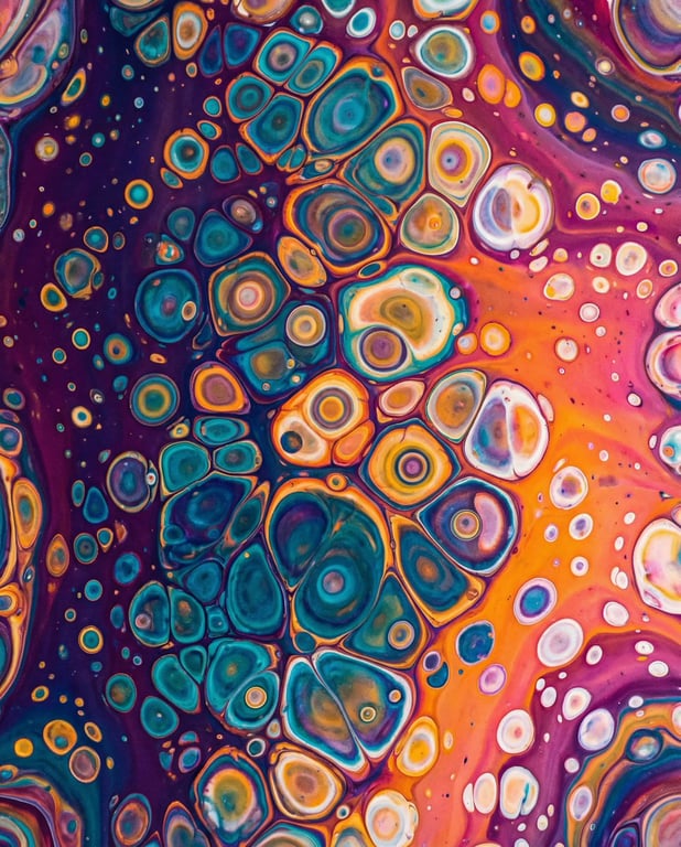 A prompt for generating a vibrant, abstract close-up image of a fluid art pour. It emphasizes a mesmerizing pattern of cells and organic shapes using a vivid blend of deep blues, teals, oranges, yellows, and purples, creating a dynamic and energetic composition reminiscent of microscopic organisms.