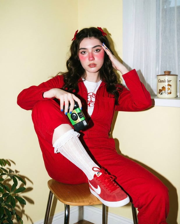 A detailed prompt for Gemini Nano Banana Pro to generate a full-body, vintage-style photograph of a young woman. The image features specific attire (red jumpsuit, white knee-high socks, red sneakers), distinctive makeup (flushed pink cheeks), props (vintage camera), and technical details like direct flash lighting and grainy film aesthetic.