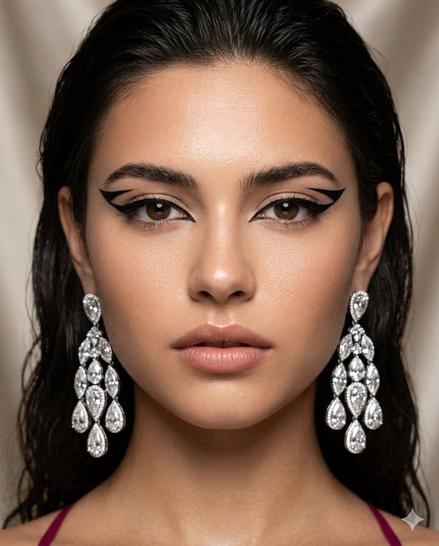A prompt for generating a striking, Vogue-style beauty editorial portrait focusing on bold makeup and jewelry. It specifies 'butterfly lighting' for defined features and includes a critical instruction to maintain the exact facial features of a reference image.