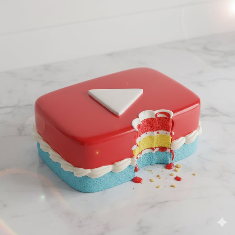 A structured prompt for generating a hyper-realistic digital illustration of a cake meticulously shaped to resemble a specific logo. The prompt focuses on shattering the illusion by showing a bite mark that reveals vibrant, multi-layered interior textures, set with soft, diffused lighting against a minimal background to create a visually convincing and appetizing image with whimsical undertones.