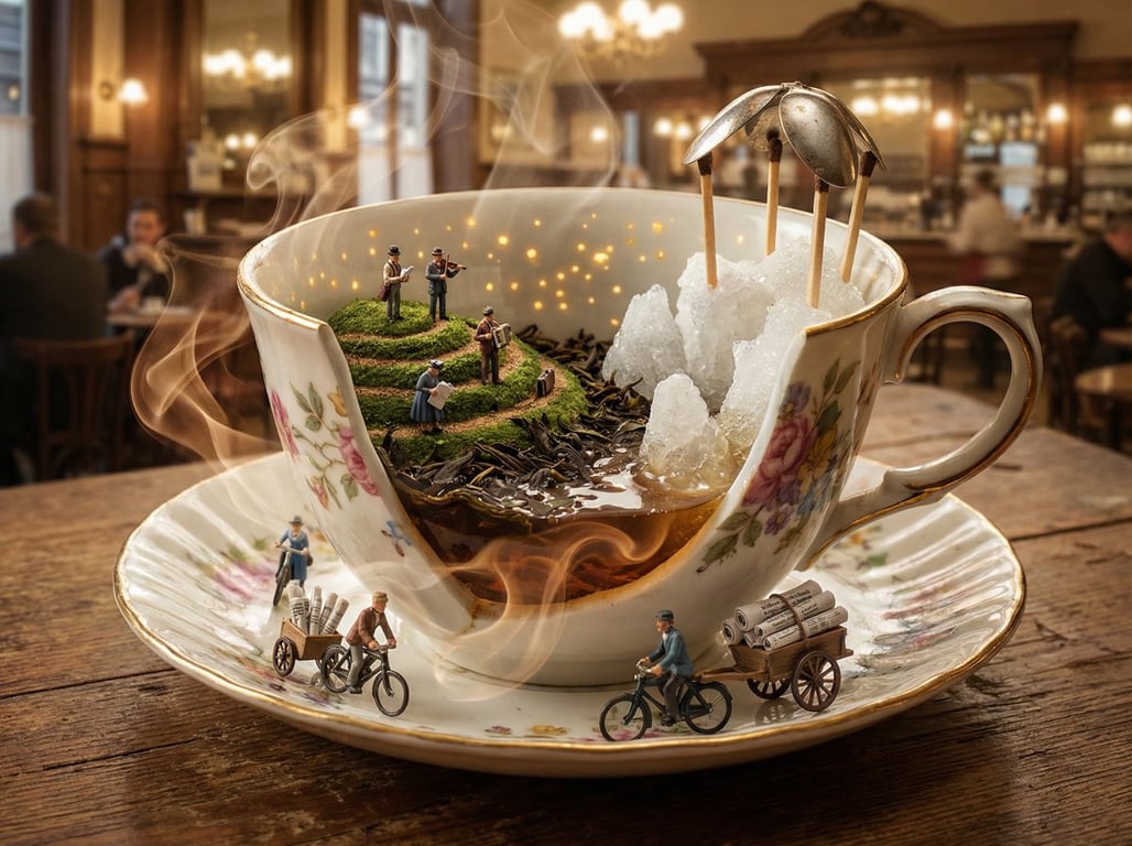 A structured, fill-in-the-blank prompt template designed to generate a cinematic 3D image where a small object opens up to reveal an entire miniature world or landscape spilling out, emphasizing surreal scale contrast and poetic world-building.