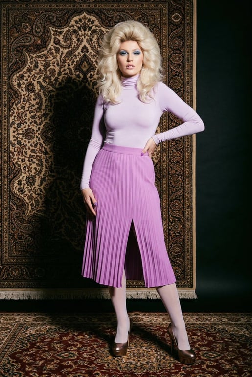 A detailed JSON-formatted prompt for Nano Banana (likely Nano Banana Pro) to generate a 1970s high-glamour fashion portrait of a female model, specifying clothing, pose, lighting, and technical camera settings.