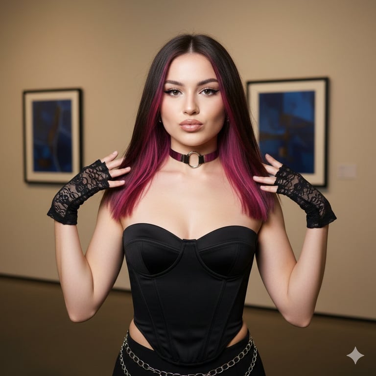 A structured prompt for generating a portrait image with a specific 2000s digital camera/influencer flash aesthetic. It details the subject's appearance, including fuchsia face-framing highlights, a corset top, and chrome accessories, set against an indoor exhibition space with direct flash lighting.