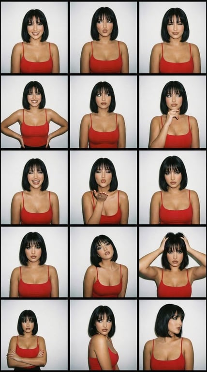 A highly structured JSON prompt for generating a 4x4 contact sheet grid (16 frames) of the same adult woman. It specifies a 2000s photobooth aesthetic, using direct on-camera flash, medium analog film grain, and a red satin spaghetti-strap top, detailing 16 unique poses and expressions for consistency across the grid.
