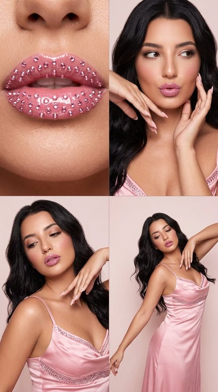 A highly structured prompt for Nano Banana Pro to generate a 2x2 photorealistic beauty-fashion editorial grid. The focus is on glamorous soft pink lips covered in rhinestones, coordinated with a soft pink satin dress, featuring one consistent female model in various graceful, dance-inspired poses.