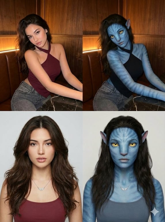 A complex JSON prompt for generating a 2x2 grid collage demonstrating a transformation from a human female subject to a Na'vi/Avatar hybrid, maintaining pose and setting consistency across the panels, with one row set in a bar booth and the other in a studio portrait.