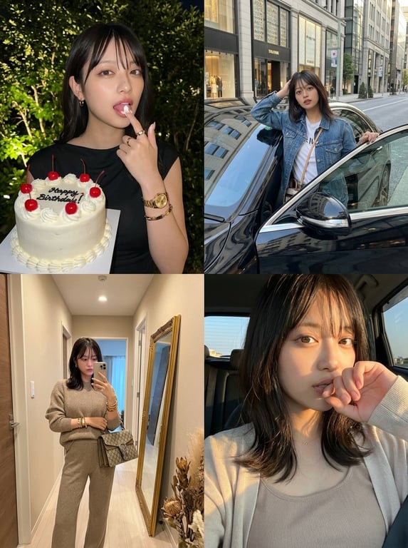A highly structured JSON-based prompt for Nano Banana Pro to generate a 2x2 grid photo collage. It strictly locks the identity of the subject from an uploaded image while varying the setting, action, and outfit across four distinct panels (night outdoors, city street, mirror selfie, golden hour vehicle).
