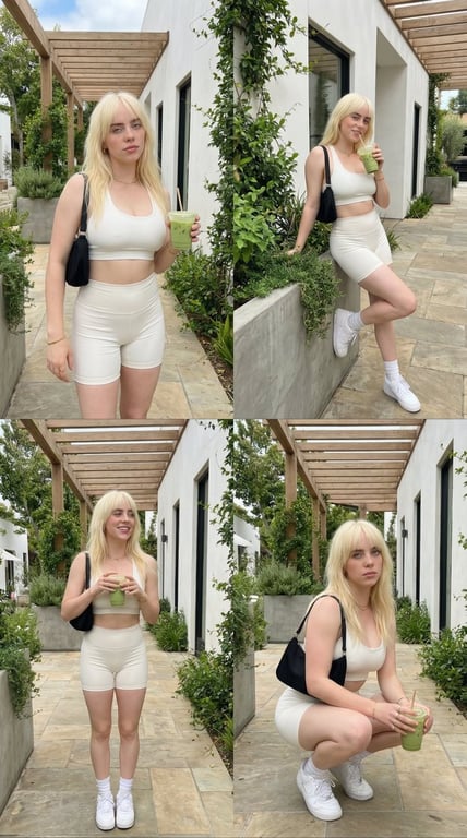 A structured prompt for generating a 2x2 grid collage of lifestyle fashion photographs featuring a subject in an athletic set at an outdoor café walkway. It specifies clean, aesthetic styling, natural daylight, and four distinct poses/activities, maintaining consistent framing and color palette across the images.