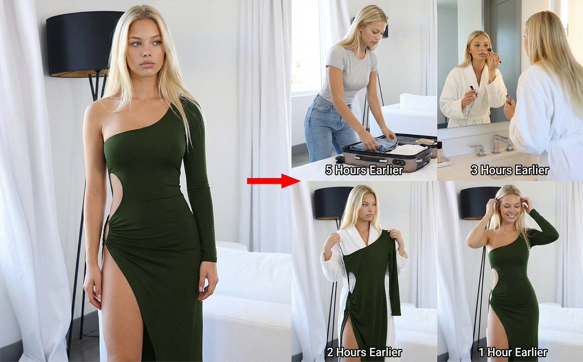A creative prompt designed to generate a 2x2 grid collage showing the events that transpired 5, 3, 2, and 1 hour before the scene depicted in an uploaded reference image, useful for visual storytelling and context generation.