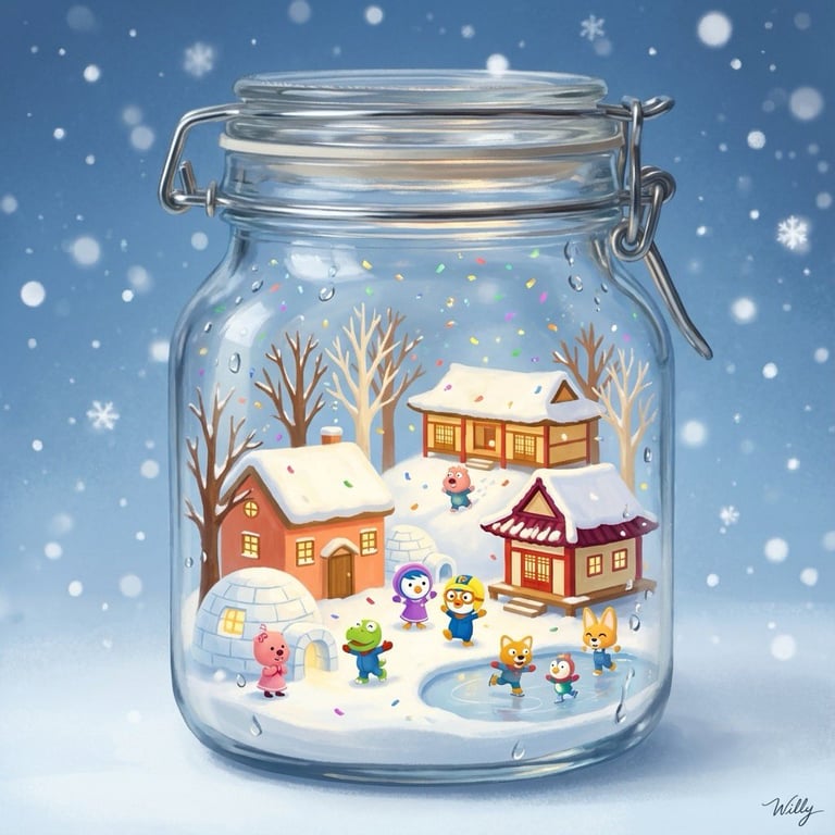 A detailed prompt for Gemini Nano Banana Pro to create an image of an ingenious 3D miniature snow globe inside a glass Mason bottle. The scene features the character Pororo, a miniature winter village with Hanok-style houses, snow roofs, and specific color palettes, aiming for a magically cozy, nostalgic Christmas atmosphere in an impressionist style.