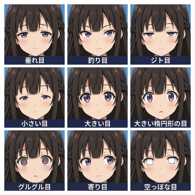 A detailed prompt designed to generate a 3x3 grid of nine images, all featuring the same girl character (from an attached image) in a close-up portrait, but with nine different, more abstract or intense Japanese eye expressions, labeled below each square.