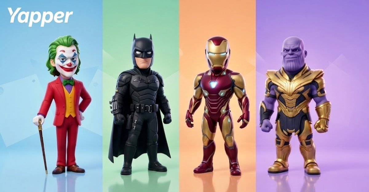 A prompt for Nano Banana Pro to create a clean 4-panel split composition featuring four different stylized 3D cartoon figures (clown villain, vigilante, tech hero, cosmic villain) rendered in a Pixar-style aesthetic with soft studio lighting and vibrant pastel backgrounds.
