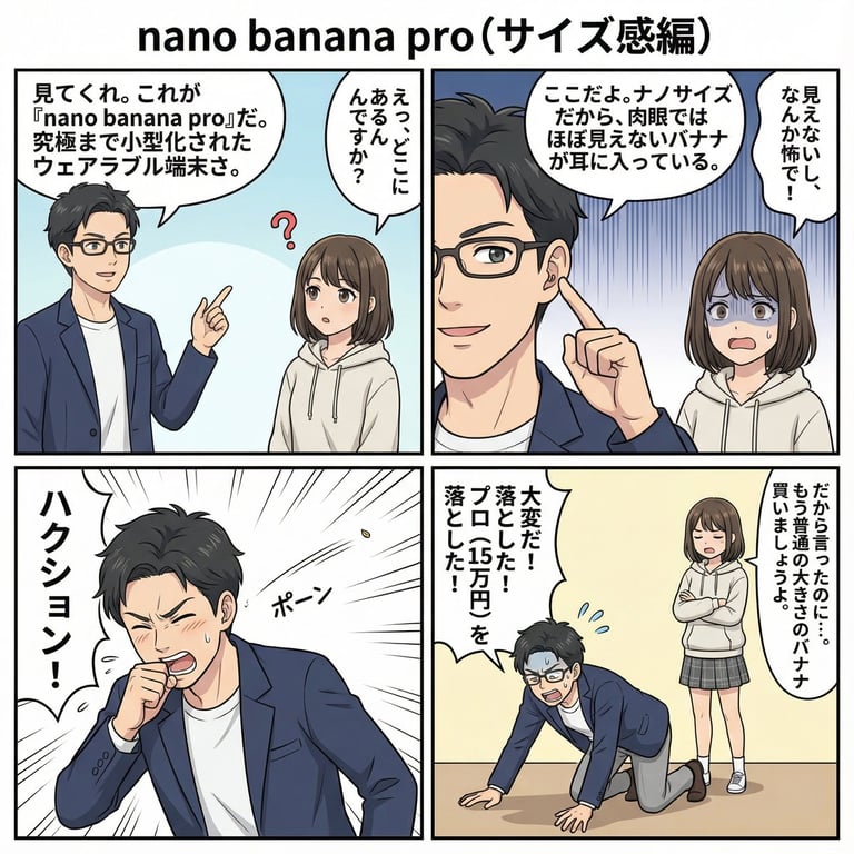 A detailed prompt that generates four different Japanese four-panel manga using provided character and panel-layout reference images, explaining Nano Banana Pro with an entertaining twist at the end.