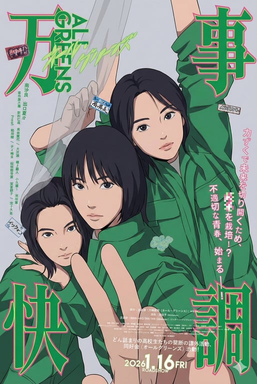 A Japanese prompt used with Nano Banana Pro to transform scenes of characters from the drama 'All Greens' (Manji Kaichou) into an 80s City Pop style illustration. The prompt specifies the names of the characters (Park Sumi, Miruku Yaguchi, Mako Iwakuma) and the desired aesthetic.