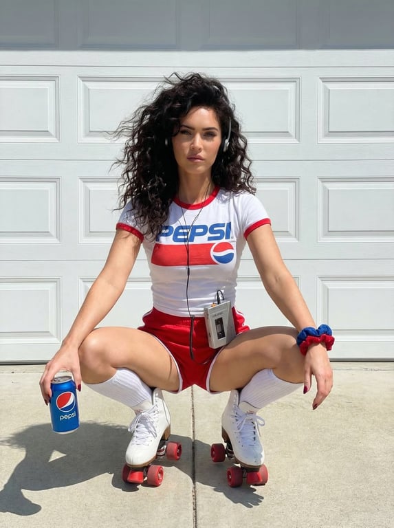 A highly detailed JSON prompt for generating an ultra-photorealistic image of a woman resembling Megan Fox in 80s retro athleisure wear (Pepsi t-shirt, red shorts, roller skates). The prompt specifies pose (squatting), accessories (Walkman, Pepsi can), lighting (midday sun), and technical camera details (50mm prime, f/4.0, 8k resolution).
