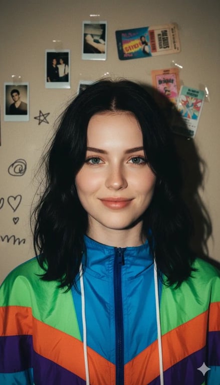 Two separate prompts for generating portraits of a young woman in a brightly colored 90s retro windbreaker. Both emphasize the use of harsh, direct flash lighting to create distinct drop shadows and a background adorned with polaroid pictures and doodles.