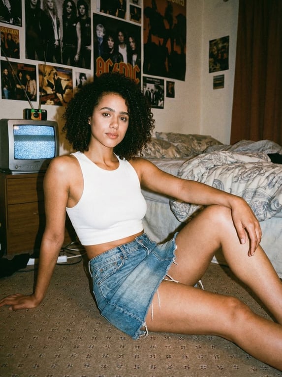 A structured JSON prompt for Gemini Nano Banana Pro designed to generate a vintage 90s film photograph aesthetic, featuring a young woman resembling Nathalie Emmanuel in casual retro attire, sitting on a carpeted bedroom floor with specific lighting (on-camera flash) and technical camera settings (35mm lens, film grain).