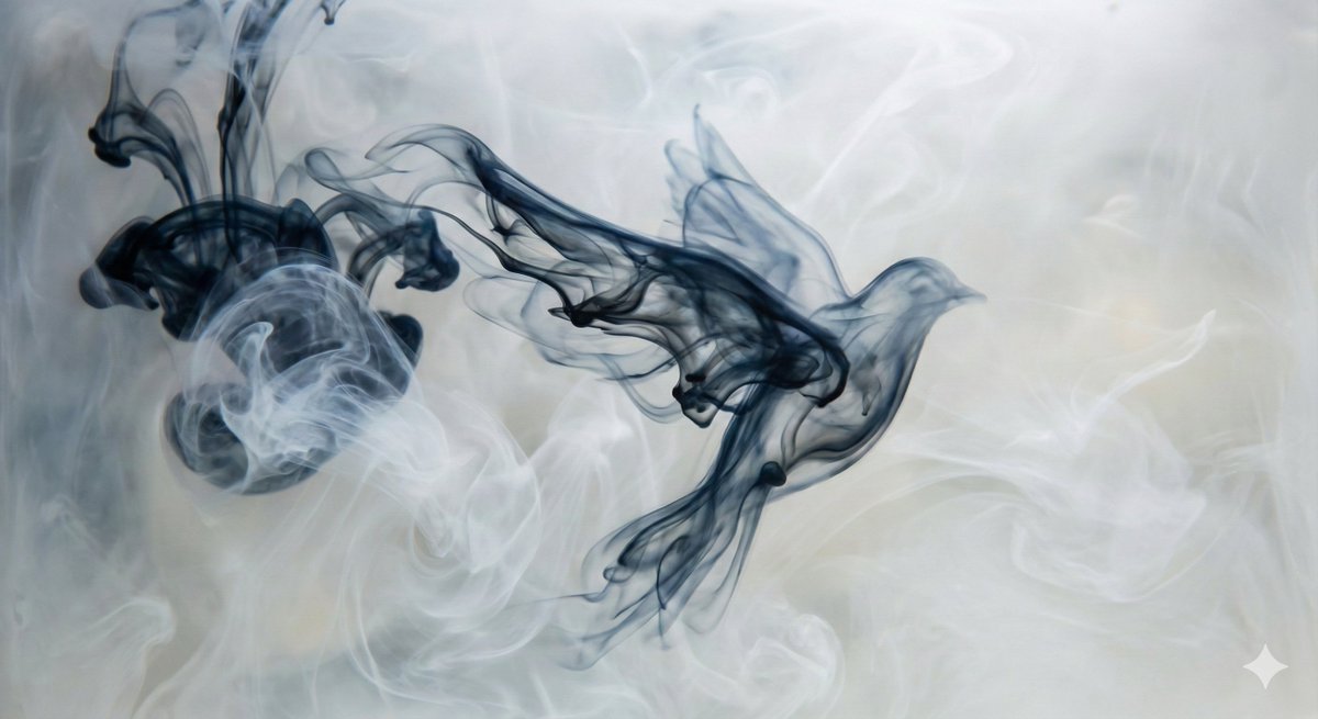 A prompt designed to generate an image with a poetic, minimalist, and dreamlike atmosphere, focusing on a subject slowly emerging from swirling black ink suspended in milky white water, rendered in a macro photography style.