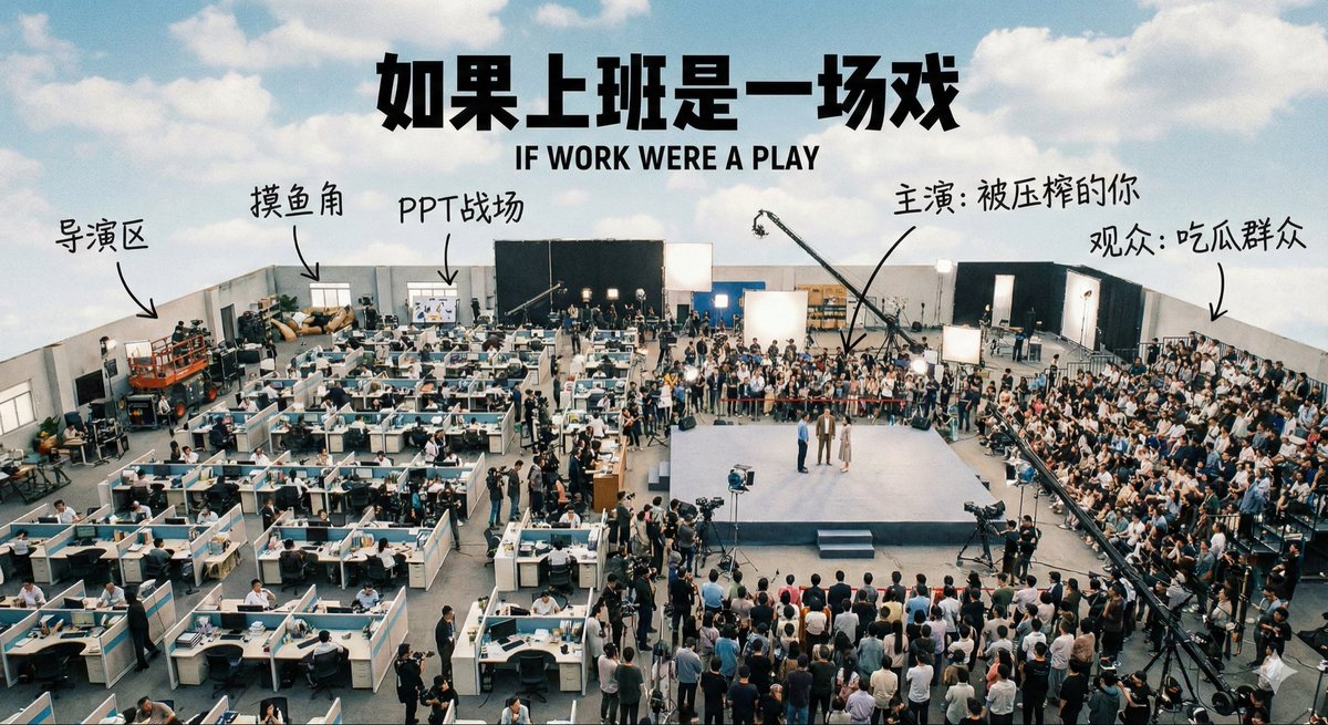 A prompt to generate an image of a film set from a high-angle aerial perspective, with annotations indicating the film being shot is titled 'If Going to Work Were a Play'.