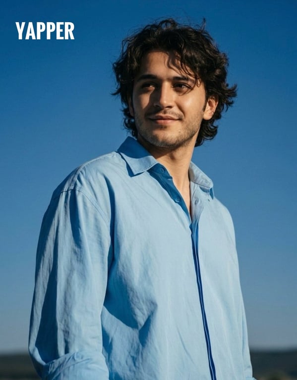 A prompt for generating an ultra-aesthetic, cinematic outdoor half-portrait of a young man with messy wavy hair, wearing a loose sky-blue oversized shirt under a deep blue sky. It emphasizes cinematic side lighting, soft shadow contours, professional DSLR quality, and a fashion editorial aesthetic.