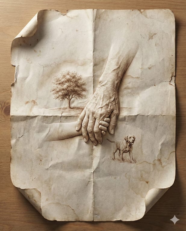 A prompt for generating an 8K ultra-realistic promotional image of a folded sheet of aged paper. The core concept is depicting a scene or memory emerging naturally from the paper's creases, utilizing textures, shadows, and ink fading to create a handcrafted visual illusion.