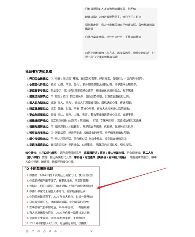 A detailed, multi-step guide for a content creator using AI (likely an LLM like Gemini or similar) to generate viral titles and accompanying copy targeted at middle-aged and elderly audiences. Step 1 provides a template for generating 10 similar clickbait titles based on a set of examples. Step 2 provides a template for generating a short, rhyming, and conversational blessing copy based on a generated title.