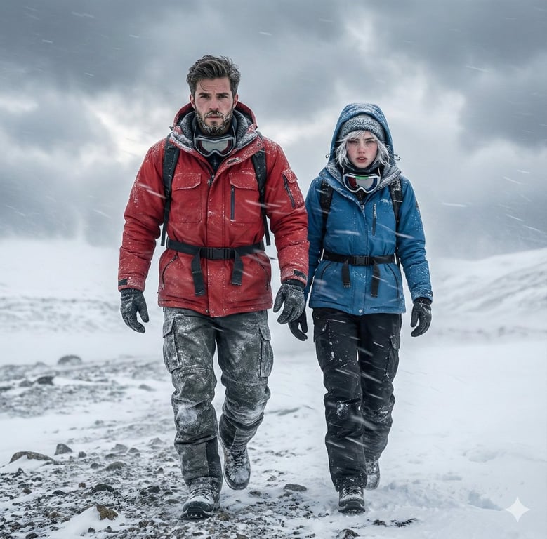 A prompt instructing the model to use a reference image of a couple and place them in a dramatic, ultra-detailed Alaskan snowstorm scene. It specifies heavy survival gear, wind-blown snow, and cinematic realism.
