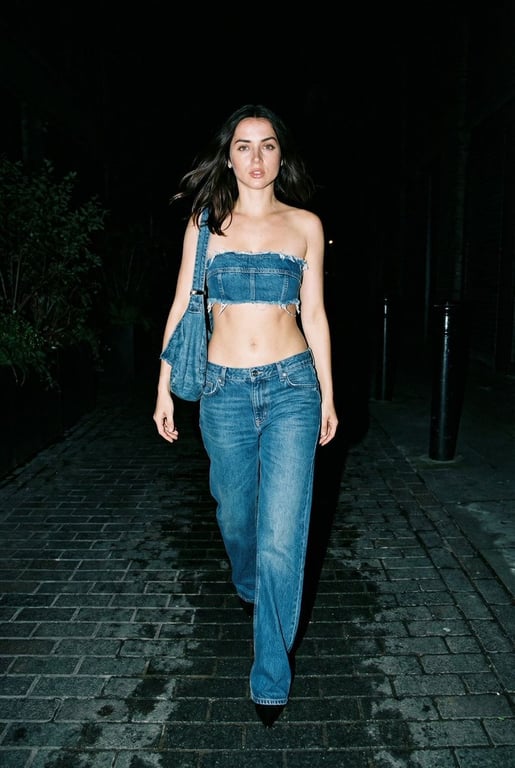 A highly detailed, JSON-formatted prompt for generating a hyper-realistic, full-body editorial shot of Ana De Armas (referenced as 'The Protagonist') in avant-garde denim, emphasizing harsh 'high-fashion flash' lighting, high contrast, and a raw, tactile atmosphere reminiscent of 90s paparazzi aesthetic, shot on Kodak Portra 800 film.
