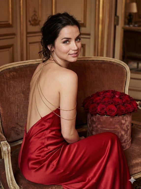 A highly conceptual and structured prompt for a portrait of Ana de Armas, titled 'Romantic Opulence,' focusing on a theatrical romance aesthetic. It details her pose (seated, looking back), wardrobe (red open-back dress, gold chain jewelry), and environmental props (round luxury box of red roses), emphasizing psychological layers and visual contrasts.