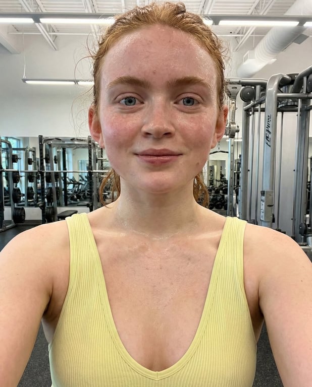 A highly specific JSON prompt for generating a raw, photorealistic, high-angle selfie of a woman resembling Ana de Armas, intensely sweating and exhausted while leaning over a weight bench in a gym, emphasizing realistic skin texture and harsh overhead lighting.