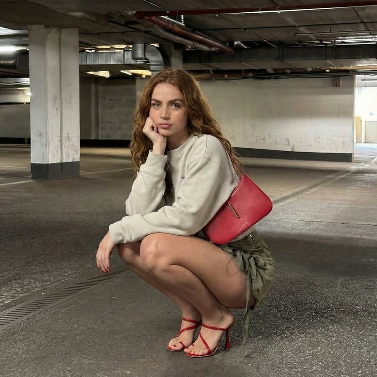A highly specific JSON prompt for generating an ultra-realistic, cinematic portrait of Ana de Armas in a squatting pose within an urban parking garage. Crucially, this prompt uses 'identity lock' and 'pose lock' rules, requiring the AI to strictly adhere to external reference images for the face, hair, pose, scene, and lighting, while applying a modern street fashion outfit.
