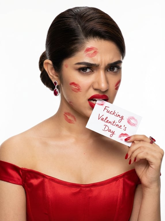 A detailed prompt for an ultra-realistic studio beauty portrait of Krithi Shetty with an annoyed expression. The scene is high-key, featuring bold red lipstick, multiple red lipstick kiss marks scattered across her face, and her biting a card that reads 'Fucking Valentine's Day'. The prompt specifies camera gear, lighting, and cosmetic advertising level detail.
