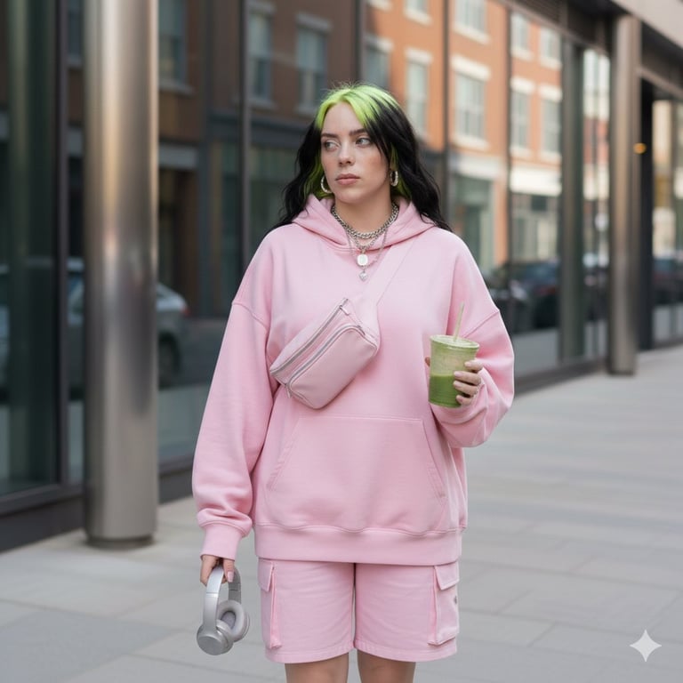 A detailed prompt for generating an ultra photorealistic lifestyle portrait of a subject resembling Sadie Sink in a monochromatic pink athleisure outfit (halter crop top and mini skirt), set in an urban street scene with soft natural daylight.