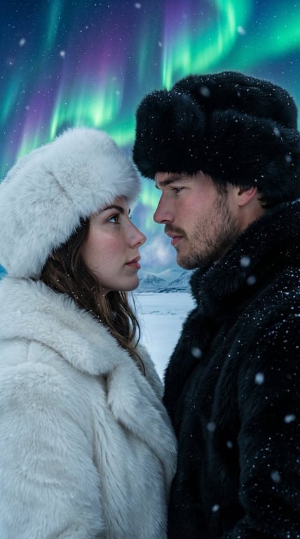 A highly specific prompt for generating an ultra-photorealistic couple portrait under the Northern Lights, requiring 100% identity preservation from uploaded reference images, focusing on romantic expression, detailed winter clothing, and realistic Arctic lighting.