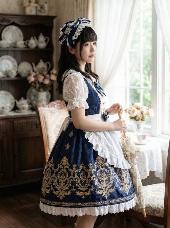 An image generation prompt detailing the creation of a photorealistic image of a beautiful Japanese young woman wearing a highly ornate, navy blue and white Lolita dress with baroque design elements, gold trim, and intricate lace details.
