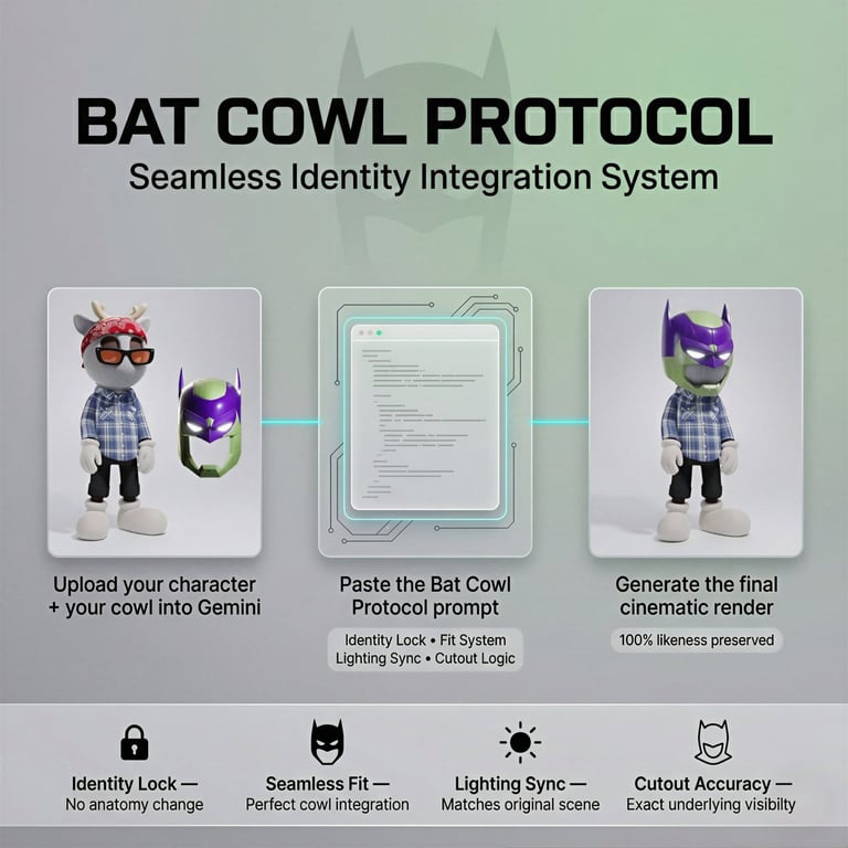 A complex prompt for Nano Banana (or Gemini Nano Banana) to generate a high-quality 3D render of a designer toy character, integrating a custom 'Bat Cowl' from a reference image onto the character while strictly maintaining the character's original outfit, likeness, and lighting conditions.