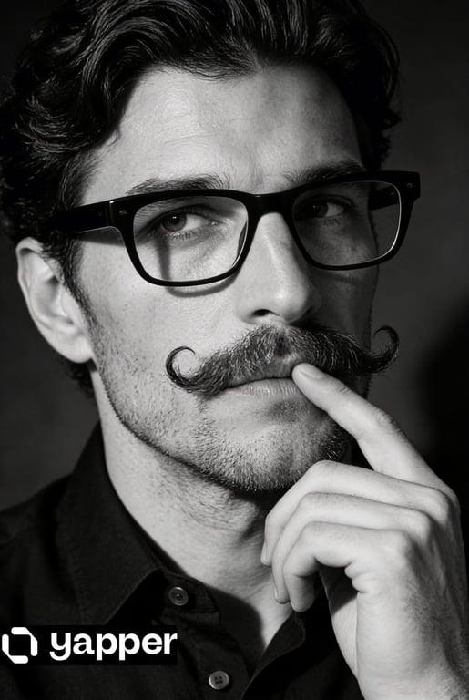 A photorealistic prompt for Nano Banana 2 to generate a black and white close-up portrait of a thoughtful middle-aged man with a handlebar mustache and glasses, captured with dramatic studio lighting and high contrast in the style of classic portraiture.