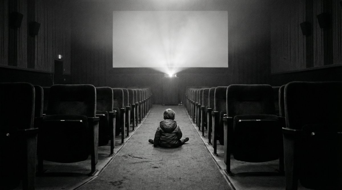 A prompt for Google Nano Banana Pro to generate a black and white documentary photograph capturing a sense of solitude: a single child sitting on the floor of an almost empty cinema hall, facing the glowing screen, with deep shadows and projector light haze.